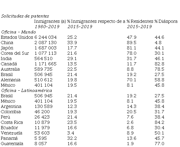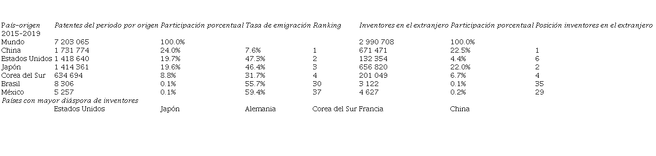 Los datos de patentes constituyen un indicador inigualable para estudiar una serie de fenómenos relacionados con la innovación y la movilidad de inventores; esos datos se asocian con una clase específica y más homogénea de trabajadores altamente calificados que la que se obtiene cuando se clasifican por nivel de escolaridad (WIPO, 2013). En el apartado de métodos y datos se expresa que la información PCT proporciona la nacionalidad y país de residencia del inventor, al menos uno de ellos. Esta información permite conocer qué países son líderes en inventores nacionales, quiénes tienen la diáspora más grande que busca patentar en una oficina extranjera y cuáles son líderes en inventores nacionales que quieren patentar en la oficina de su país. En el periodo 2015–2019 China fue el líder mundial en la emisión de patentes por nacionales (con más de 6 millones), le siguen los nacionales de Estados Unidos (1.4 millones), Japón (1.3 millones) y Corea del Sur (800 mil). Los chinos solicitaron patentar 2.4 veces más que los estadounidenses, 2.8 veces más que los japoneses y 5.4 veces más que los coreanos. Con una brecha notable le siguen Alemania y Francia; mientras que Brasil se colocó en la posición 24 y México en la 33, los brasileños emitieron 2.8 veces más solicitudes que los mexicanos, 3.8 veces más en la oficina de origen y su diáspora emitió 1.7 veces más que la diáspora mexicana. A diferencia del resto, China cuenta con una diáspora de apenas 4.8 por ciento. En términos relativos los países con la proporción más alta de inventores nacionales que patentan en una oficina extranjera son: México (45.8 por ciento), Estados Unidos (44.6 por ciento), Japón (44.1 por ciento), Alemania (58.8 por ciento), Corea del Sur (30.1 por ciento) y Brasil (27.5 por ciento). En términos absolutos Estados Unidos y Japón tienen la diáspora más grande, más de 1 millón de inventores emitieron una solicitud en una oficina extranjera entre 2015–2019, respectivamente (cuadro 5).
