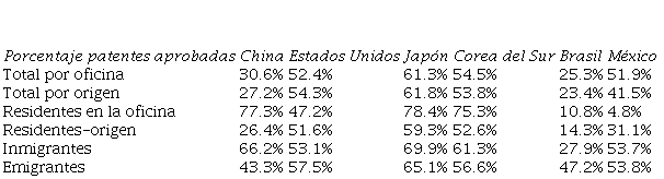 A pesar de que la oficina de México se encuentra entre las primeras 20 en el mundo con el mayor número de solicitudes de patentes y es la segunda más importante en América Latina, la posición que ocupa se debe a solicitudes de extranjeros; su lugar se modifica al tomar en cuenta el origen del inventor o del solicitante de derechos: los inventores mexicanos ocupan la posición 32 y casi uno de cada dos busca patentar sus invenciones en el exterior. La tasa de éxito es más alta para los no residentes y los mexicanos en el exterior: sólo 4.8 por ciento de las patentes son de inventores mexicanos que se dirigen a la oficina de México. Tales resultados confirman lo referido por Guadarrama (2018) acerca de los países con alta innovación e inversión en investigación y desarrollo como Estados Unidos, Corea del Sur y Finlandia, donde el progreso científico es impulsado y apoyado por fondos gubernamentales y de empresas privadas, al tiempo que la innovación ha impulsado el crecimiento económico y la creación de empleos. Las economías centrales basadas en el conocimiento promueven estrategias para la formación de una fuerza laboral altamente calificada y así aumentar los flujos de conocimiento entre empresas, universidades y centros públicos y privados de investigación.
