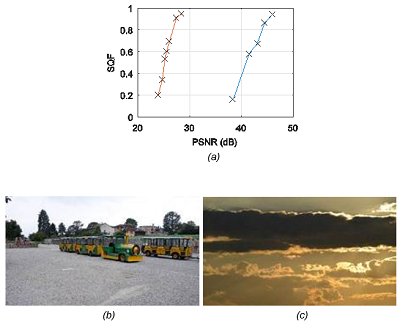 Figure 6(b) and 6(c) show the original images corresponding to the curves of Figure 6(a), i.e. the left and right boundaries on the scatter plot. It can be concluded that the points on the scatter plot are located between the JND points of the image with uniform regions and visible boundaries between them (right scatter border), and the image with a pronounced uniform region in the upper third of the image (with intensity saturation), and rich in details in the rest (left scatter border).