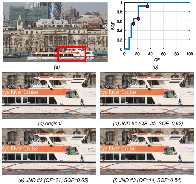 Figure 1 shows the original uncompressed image from the MCL-JCI dataset (Jin et al, 2016), its stepwise distribution of JND points and the regions of the original image and images corresponding to JND points. The results of subjective tests were given through the stair quality function (SQF), which represents the normalized cumulative sum of the JND function, and was obtained by analysing and post-processing raw JND data. The height of the SQF function for a boundary point with QF=100 is equal to one and defines the maximum possible quality. The first drop in quality corresponds to the first JND point (JND #1), and its height corresponds to subjective quality. This point corresponds to the image with QF=35, and its subjective quality is SQF=0.92. The position of the first JND point depends on the image content and for 50 source images from the MCL-JCI dataset these positions were obtained for a wide range of QF values, from 25 to 70 (Jin et al, 2016).