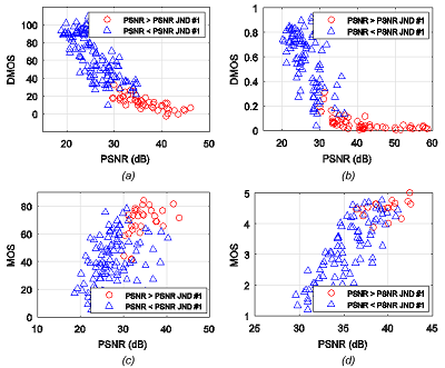 On the scatter plots, JPEG images are represented by two symbols, where the first symbol (o) corresponds to the images in which the PSNR of the test image is above the PSNR JND #1 (this is the first class of images, which should consist of high quality images, and in which there is no loss of visual information). The second symbol (D) corresponds to the images for which the PSNR of the test image is below the PSNR JND #1 (this is the second class of images that should consist of lower quality images). A similar idea of dividing images into two classes was used in (Ponomarenko et al, 2015).