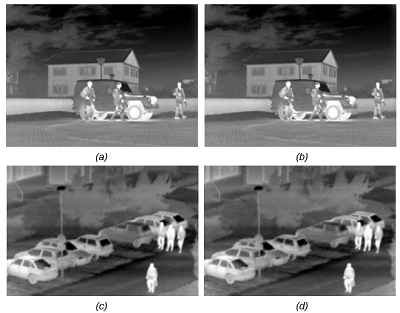 Figure 4 shows two source images from the LWIR dataset and their JPEG compressed versions for which the PSNR value is above the PSNR JND #1. The test images are of excellent and good visual quality, i.e. there is no visual difference between the pair of images shown in Figures 4(a) and 4(b) (MOS=5), while the observers noticed slight differences between the pair shown in Figures 4(c) and 4(d) (MOS=4).