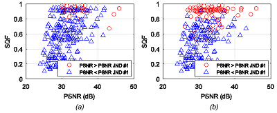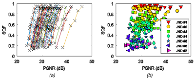 Figure 6(a) shows the curves of the JND points from the two source images, between which are the other JND points of the scatter plot between the SQF and PSNR scores on the MCL-JCI image dataset.