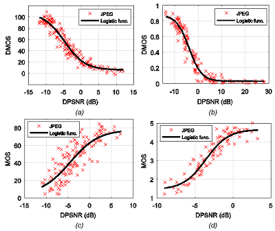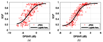 The values of the DPSNR objective measure were determined on the basis of two estimates of PSNR JND #1 – the approaches described in (Bondžulić et al, 2021) and (Lin et al, 2020). The scatter plots of the SQF and DPSNR scores on the MCL-JCI dataset and the corresponding logistic functions are shown in Figure 9, while the quantitative indicators of the degree of their agreement are given in Table 2.