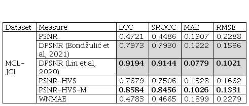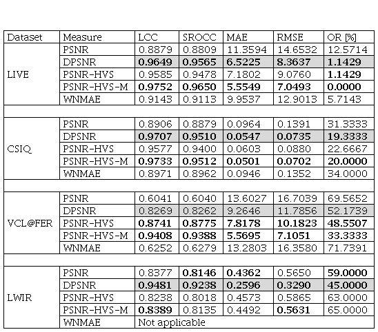 The performance of the DPSNR objective measure is significantly better than the performance of the PSNR, for all five quantitative indicators and on four datasets. It can be noticed that the performance of the DPSNR is the worst on the VCL@FER image dataset, where the original PSNR has the worst results.