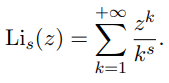 Defınıtıon 1. The polylogarithm, see (Lewin, 1981), is defined by a power series in z, given by