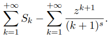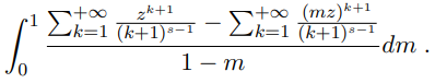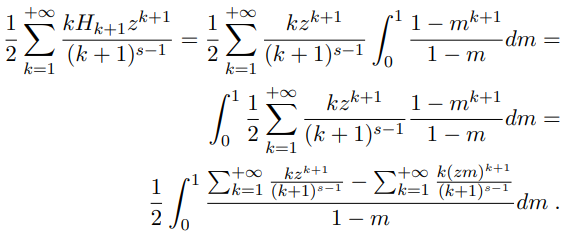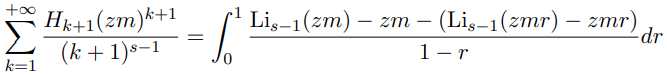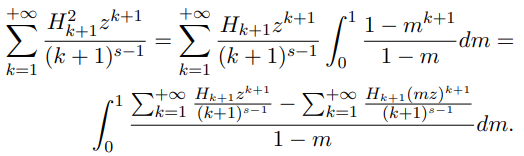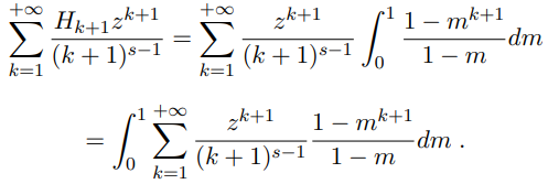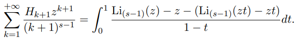 As we can see, the second sum is the expression above with s shifted by −1 and multiplied by . For the first sum, we will rewrite the harmonic number into its integral form.