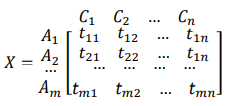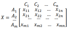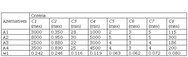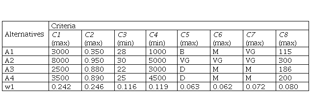 - Decision matrix – the multiple-criteria decision process can be represented in the form of a matrix. The decision matrix (mxn) is a matrix in which the element aij represents the characteristics of the alternative Ai where (i=1,2,…, m), when the alternative Ai is valued in accordance with the decision criteria Cj (j=1, 2, …, n). Also, it is presumed that the decision maker has assigned the weight criterion wj (j=1, 2, …, n).