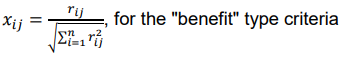 Step 1 Decision matrix values normalization. In the majority of multiple-criteria decision methods, the first step is decision matrix elements normalization in order to get a matrix in which all elements are un-dimensional values. In the TOPSIS method, vector normalization is applied, represented by expressions (2.1) and (2.2).