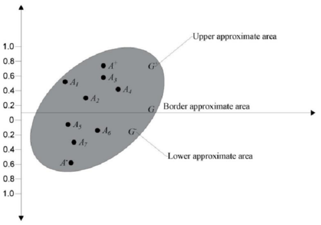 The alternative 𝐴𝑖 can belong to the border approximate area (𝐺), the upper approximate area (𝐺+) or the lower approximate area (𝐺−) or 𝐴𝑖 ∈ {𝐺 ∨ 𝐺+ ∨ 𝐺−}. The upper approximate area (𝐺+) represents the area where the alternative (𝐴+) can be found, while the lower approximate area (𝐺−) represents the area where the anti-ideal alternative (𝐴−) can be found (Figure 8)