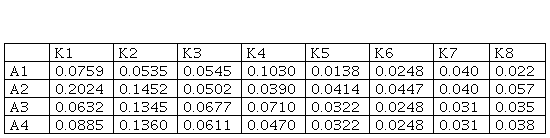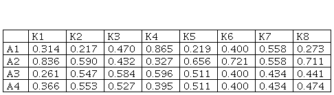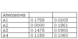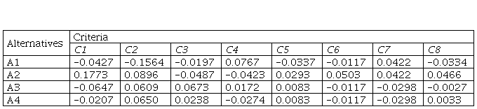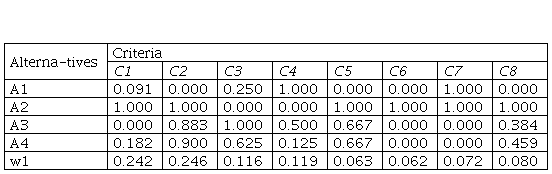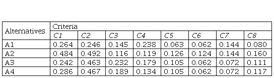 In order to obtain the aggravated normalized value matrix, it is necessary to multiply the values form Table 4 with the weight coefficients.