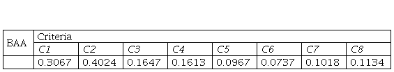 Applying the expression , we will normalize the elements of the base decision and we will obtain the matrix presented in Table 4.