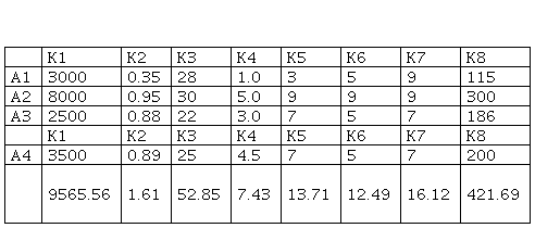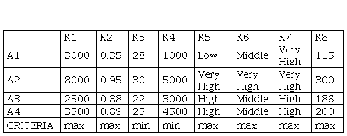 In the given table, we can notice that, for the criteria К1, К2, К5, К6, К7 and К8, the most desirable values are the highest ones (max), while for the criteria К3 and К4 (weight and price, respectively), the most desirable are the lowest values (min).