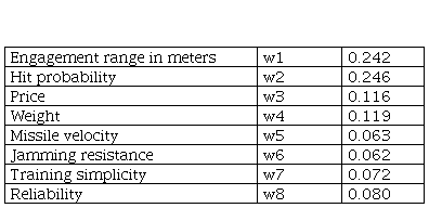 Under the assumption that we are selecting one ATGM from the proposed four ATGMs of different manufactures, represented as А1, А2, А3 and А4, the decision matrix for a ATGM selection is presented in Table 1.