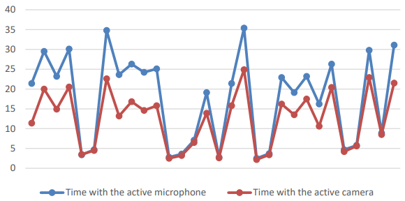 The interaction of students in relation to classical teaching is much greater. The statistics showing student interaction over a 30-day time range is shown in Figure 5. The illustration shows the relationship of meetings held with the microphone on and the camera on. The recommendation to the lecturers is that their camera is turned on all the time while they are teaching, so that the interaction of the lecture is at the highest possible level.