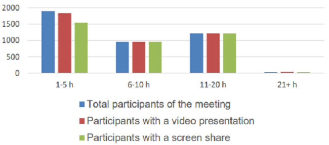 In addition to classic lectures and exercises, students use the 1-on-1 call option very often. One example of a 1 on 1 call is student and professor consultations. The average obtained on the basis of the test is such that 64% of conversations last more than 30 minutes. Based on this information, we gain insight into the fact that a large number of students use this option to develop projects in groups as well as mutual counseling. The amount of time spent on the platform in one week of lectures is visible in Figure 1. Based on the illustration, we can conclude that professors who teach in most cases use video and audio as well as screen sharing at the same time. This way of presenting creates a much greater interaction between students. Students are able to see some practical interactive examples in addition to listening to lectures.