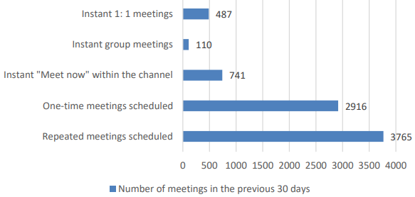 Lecturers often use graphic boards during lectures in order to interact with the presented materials at the highest possible level. In addition to technology, the interaction is directly affected by the quality of knowledge transfer by the lecturer. The number of meetings organized on the Microsoft Teams platform in the previous 30 days is shown in Figure 2.