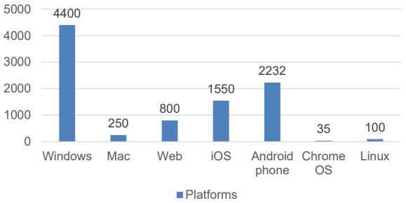 Looking at the log files of the Microsoft Teams platform, we came to the conclusion that the largest number of users access the platform via computers with the Windows operating system, although a large number of system users have the ability to access via mobile phone. The time range of the graphs is 30 days. The distribution of licensed system users can be seen in Figure 3.