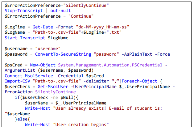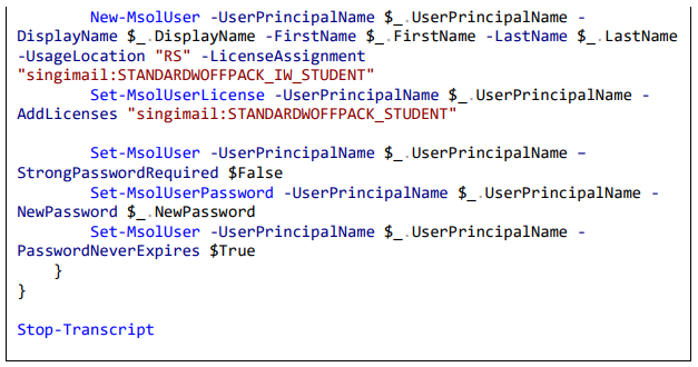 The existing infrastructure made it possible to retrieve student information from the database. The information that was needed for the successful completion of the integration is the student's e-mail and the ID of the team in which the student is. Student information is automatically read from the database and sent in .csv format to the shared disk of the existing infrastructure. For this type of integration, a PowerShell script was used, which is run using a .bat file every hour. It is primarily necessary to create new student emails using the PowerShell environment. The initial password for all University students is their JMBG number. Changing all student passwords is enabled using the PowerShell script. The first step in developing an automated proposed solution is reflected in the creation of new student Microsoft Office 365 email addresses. The PowerShell script codes are shown in the next section of the paper.