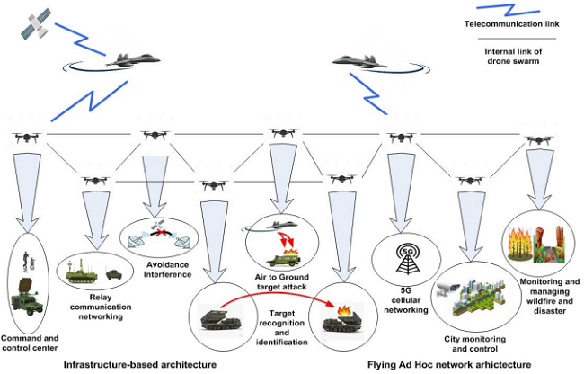 To provide seamless communication service to ground users over a wide area, a swarm of UAVs constructs a multihop network. Such architecture has centralized coordination enabled by ground infrastructure with computing capabilities (Campion et al, 2018, pp.903-908).