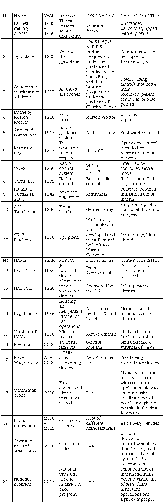 In should be noted that the earliest military drones appeared in the mid-1850s. The conception dates back to 1849 during the war (see Table 1) between Austria and Venice. Unmanned balloons with explosives were used. The Austrian forces launched around 200 incendiary balloons with 11 kg to 14 kg bombs each. It is interesting to note that only one bomb found its mark, while most of the balloons were blown away due to a change in wind direction. From the point of view of military technology, the use of balloons does not meet the current definitions of drones.