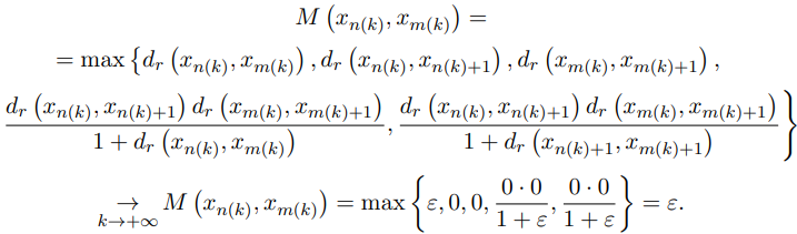 Therefore, we get that dr(xn,xn+1) < dr(xn−1,xn). This means that there exists limn→+∞dr(xn,xn+1) = dr*r ≥ 0. If dr* > 0, then from (3) follows