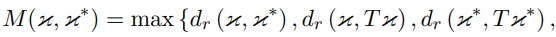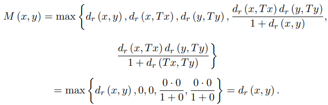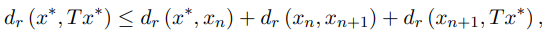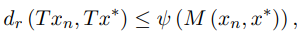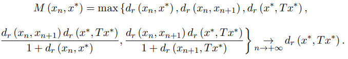 whenever n ≥ n2, taking the limit, we obtain dr(x*, Tx*) = 0, i.e. x* = Tx*, which is a contradiction.