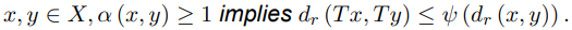 By taking in (6) the limit as n → +∞ and by using Proposition 8 and the continuity of the function ψ, we get dr(x*, Tx*) ≤ ψ (dr(x*, Tx*)) < dr(x*, Tx*) if x* Tx*, which is a contradiction. Hence, x* is a fixed point of T.