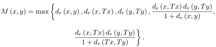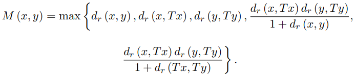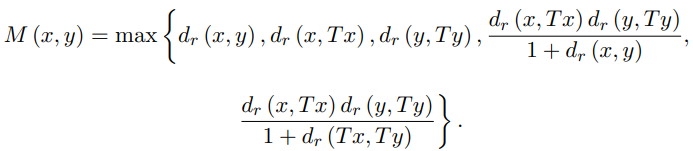 - Ćirić 1: Ćirić’s generalized contraction of first order: there exists k1 ∈ [0, 1) such that for all x, y ∈ X holds: