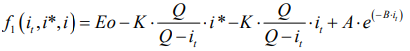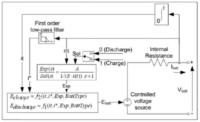 where: E0 - constant voltage [V]; K - polarization constant [V/Ah], or polarization resistance []; i* - low-frequency current dynamics [A]; i - battery current [A]; it - extracted capacity [Ah]; Q - maximum battery capacity [Ah]; A - exponential voltage [V]; and B - exponential capacity [Ah−1].