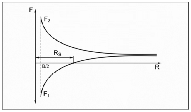 The track forces are radius dependent as shown in Figure 9. It can be seen that the outer track force has a positive sign, i.e. it is a tractive force at all turning radii, while the inner track force is a tractive force at radii larger than Rs, while it is a braking force at smaller ones.