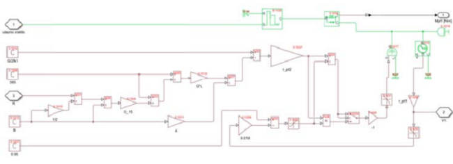 On the outer track, the torque on the sprocket wheel is always calculated from expression (13), and on the inner track from expressions (13) and (14), depending on the sign of the force on the track. The block diagram of the load model on the inner track is shown in Figure 10.