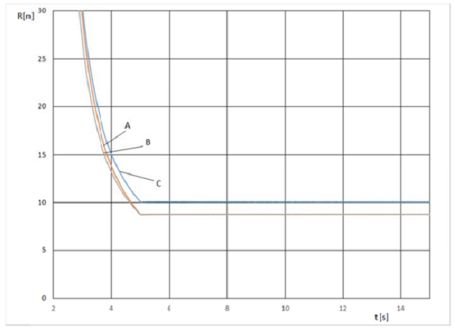 Based on the developed model, the simulation of the vehicle movement with the hybridized transmission during turning was performed. In order to see the hybridization influence on the turning performance, a simulation was performed in three motion modes: turning with the deceleration of the internal track - asymmetric turn (case A), turning with the deceleration of the inner and acceleration of the outer track, with a turning radius as in the previous case - symmetrical turn with a lower initial speed (case B), and turning with the deceleration of the inner and acceleration of the outer track but without reducing the speed of the vehicle - symmetrical turn (case C). The first case is completely equivalent to the behavior of the conventional transmission and it is a reference case for assessing the hybridization impact on the performance of turning. It is important to note that even though the turn is performed equivalent to the conventional system, there are significant advantages over the conventional system. The main advantage is the fact that the rotation is continuous, i.e. it is achieved without power losses due to friction in the transmission elements. The B and C cases of turning are not possible with the conventional transmission. In contrast, the hybrid transmission allows such cases of turning by choosing the way of controlling electric motors in the auxiliary drive, which means that the possibility of their use is realistic. The B case represents the rotation of the vehicle with the same radius as in the A case, and since the rotation is essentially symmetrical, it is achieved with a lower initial speed. The C case is a classical symmetrical turn and is achieved at the same initial speed as in the A case. The diagram, Figure 11, shows the change of the turning radius for all three considered cases, where the previous statements are confirmed.