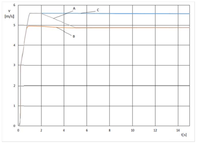 Figure 12 shows the speeds of the vehicle during the simulation of the turning process. The simulation includes starting the vehicle from the point of zero velocity, moving at a constant speed, entering a turn, and moving in a turn with a constant radius. It can be seen that from the aspect of changing the speed of movement, the B and C cases are favorable because there is no change in the speed of the turn.