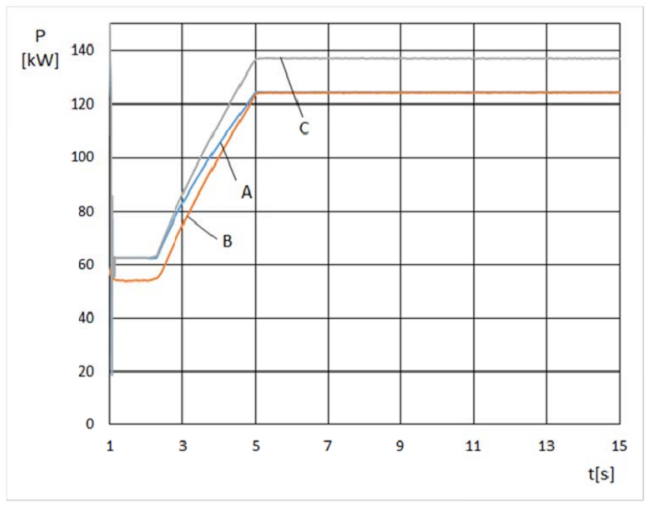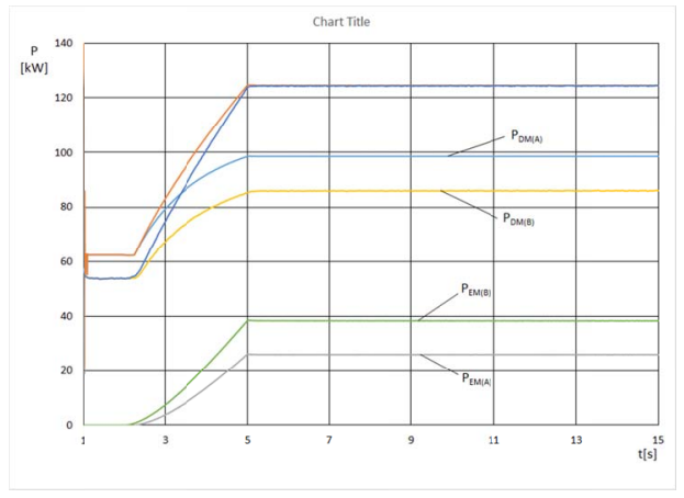 In order to perceive the performance of the turn, it is necessary to analyze the power needed for individual cases of the turn. As the power of the basic drive unit - diesel engine and the power of the electric motor in the auxiliary drive - is engaged in the turn, it is necessary to analyze the value of these powers, as well as their ratio. Figure 13 shows the total power engaged to perform the turn. In the C case, the greatest power is engaged, bearing in mind that the turn takes place at a higher initial speed, but it is important to note that, in this case, the turning radius is larger, which is even more unfavorable. In the cases of A and B, practically the same power is engaged, but two facts must be taken into account: 1) the initial speeds are different and 2) the same turning radius is achieved. As the movement speed directly affects the number of revolutions of the ICE, it is important to analyze the relationship between the power of the drive motor and the power that is supplied to the transmission via the auxiliary drive, i.e. via the electric motor.