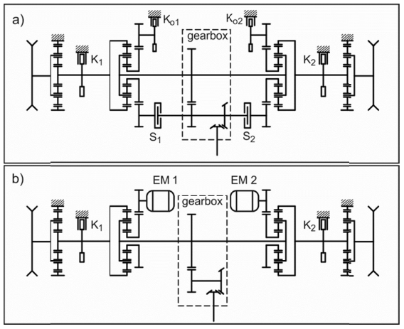 There are several possible conceptual solutions for the hybridization of the BVP M80A drive, and in this paper a solution was chosen that should not imply radical design changes to the conventional transmission. Therefore, it is a parallel hybrid architecture, with two electric motors installed in the auxiliary drive. The kinematic schemes of both conventional and hybrid transmissionsare given in Figure 1.