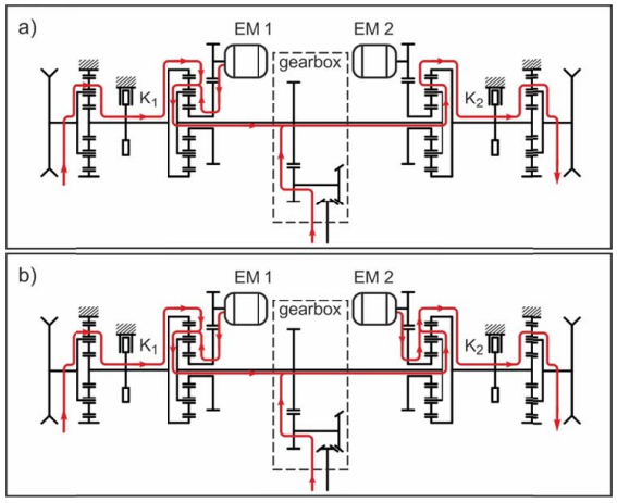 The electric motors can fine-tune angular velocity, in both directions, independent of the internal combustion engine (ICE) which means that electric motors can have a wide range of angular velocities, from a maximum angular velocity with a negative sign to a maximum angular velocity with a positive sign without any dependence on the ICE. For that reason, when determining power flows, it is necessary to pay attention to the direction of the sun gear angular velocity and to the possibility that the sun gear angular velocity is that much higher than the carrier angular velocity that the ring gear angular velocity changes direction. This case is precisely the flexibility offered by the independent auxiliary drive that gives the option to select (adjust) the kinematic turning parameter.