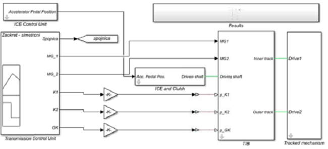 Drivetrain model control is achieved with the "ICE Control Unit" and "Transmission Control Unit" blocks. The key element of the "ICE Control Unit" block is the standard Simulink Longitudinal Driver block based on literature (MacAdam, 1980). The main function of this block is to define the required speed of the vehicle, which is achieved by adjusting the accelerator pedal position so that the preset speed is reached as soon as possible. The transmission control unit is modeled in the form of control signals which adjust the transmission parameters according to a predefined scenario. As the subject of the paper is not the automation of electric motor control, it was adopted to control them by speed signals that are set according to the predefined control scenario. In addition to the signals controlling the electric motors, the block also includes the control signals for the clutch and the main brakes. The clutch control signal allows the simulation of the vehicle when it starts to accelerate from the point of zero velocity, while the brake control signals in this particular simulation are not used, since brakes are not activated in the considered turning mode.