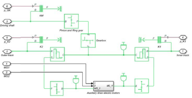 In order to analyze the performance of different variants of hybridized transmission operation, a Simulink model of the M80A infantry fighting vehicle drive compartment with the hybridized transmission was developed. The basic structure of the drive group model is shown in Figure 3. Before the formation of the drive group simulation model, the basic components of the electric drive were selected, which is described in more detail in (Milićević, 2019).