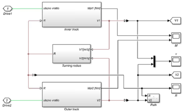 The "Tracks" block (Figure 7) is a subsystem of the Simulink model which represents resistance loads of the drive compartment, i.e. the resistance to the movement of the vehicle when performing a turn. Resistances to movement have a complex nature and depend on the type of soil, slope, distribution of specific pressures on the soil, turning radius, etc. (Muždeka et al, 2004). For this paper, a simplified turning resistance model is considered in the analysis of turning performance with the following assumptions: