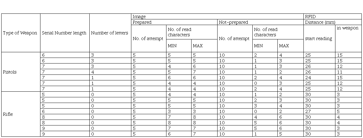 The time required to recognize a serial number is greater than that of the image previously processed and ranged from 5s to 20s. The precision was much lower and ranged from 0 to 70% of the maximum read characters of the serial number. The reading results are shown in Table 1. Characteristically, the whole serial number of the weapon was not recognized in any of the 150 recognition attempts. One possible solution to solving image processing speed and serial number recognition quality would be to use a server that recognizes the image as described in (Saleous et al, 2016).