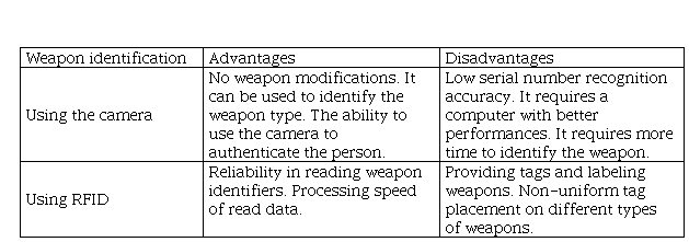 Two approaches have been used to address the problem of identification of weapons and keeping their records. The first approach to solving the problem of identifying a weapon is based on something possessed by the weapon, while the second approach is based on something attached to the weapon. In the first approach, a camera was used to read the existing serial number of the weapon, while in the second approach, RFID technology was used.