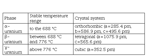Uranium is a relatively soft, silvery-light metal of high density. It occurs in three allotropic modifications, Table 1 (Binder, 1999, pp.674-682).