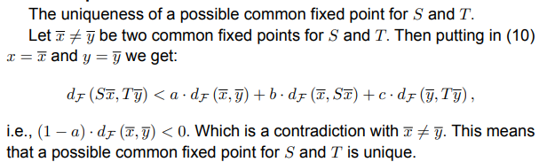 for a, b, c ∈ [0, +∞) such that a2 + b2 + c2 > 0 and a + b + c < 1. Then S and T have at most one common fixed point in X, if one of the mappings S or T is continuous.