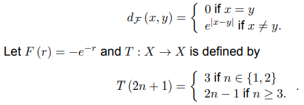 i.e., e−|T x−T y| > a · e−|x−y|. Taking x = 2n + 1, y = 2m + 1, n m we further obtain e−|2n−2m| > a · e−|2n−2m|. Since n m this means that there exists a ∈ [0, 1) such that (9) holds true, i.e., T has a unique fixed point in X = {2n + 1 : n ∈ }, which is x = 3. Note that limr→+0 F (r) = −1, then Theorem 3 from (Asif et al, 2019) is not applicable here. This shows that our results are proper generalizations of the ones from (Asif et al, 2019).