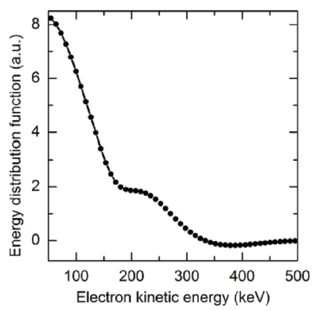 Let us consider one of striking experimental examples in which this effect of the appearance of electrons with anomalous energies is observed (Kozyrev et al, 2010). In this experimental paper, a RADAN-220 nanosecond high-voltage generator was attached to an IMAZ-150E vacuum diode in a simple circuit with 20 W ballast impedance. The voltage pulse waveform was a trapezium having an amplitude of 250 kV with a total pulse duration equal to 2 ns and the 0.5 ns risetime. We reconstructed an energy spectrum by using the Tikhonov regularization routine (Kozyrev et al, 2010) thus obtaining two spectral groups of electrons. This could be seen in Figure 1. The main group represents the majority of low-energy electrons with the mean energy values continuously decreasing to ~ 200 keV. The second group is an ensemble of high-energy (“anomalous”) electrons with the mean energy maximum around 220 keV and with a long “distribution tail” stretching to ~320 keV. Such “anomalous” distributions arise in multiple experiments considering vacuum diodes of different configurations where ultra-short pulses have been applied to them.