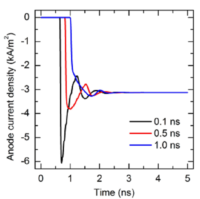 In the following plot (Figure 2), we compare three diode current density time profiles given for different values of risetime. For the same Umax, we take the quasi-stationary risetime value ~1 ns, i.e. compared to the simulation end time (5 ns), as well as subnanosecond risetime value ~0.1 ns and the intermediate value ~0.5 ns. We can easily notice that the current density profiles significantly differ. Long (quasi-stationary) risetime leads to a slow growth of a collector current to the value equal to Child’s law (1). We get a completely contrasting situation if the risetime is much less than one nanosecond. In this case, the emergence of relaxation oscillations can be seen in the transition region. The maximum amplitude of relaxation oscillations significantly exceeds the Child's value (1). In all three cases of the calculation presented in Figure 2, the diode (collector) current finally reaches the values equal to (1). Also, there is a time delay between t = 0 and the time point of non-zero collector current. This time delay determines an instant from which the electron beam reaches the anode (collector).