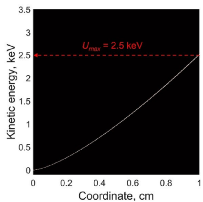 Let us consider a planar vacuum diode having the following parameters: D = 1 cm and Umax = 2 kV. It turns to be nonrelativistic, so one can assume the relativistic factor to be ~ 1. At the cathode, we take an average electron density to be around ~1.5×1018 m-3 and thermal spread ~1 eV. For these values, the emission current value is much higher than Child’s value (1), so the cathode can be assumed to have unrestricted emission capability.
