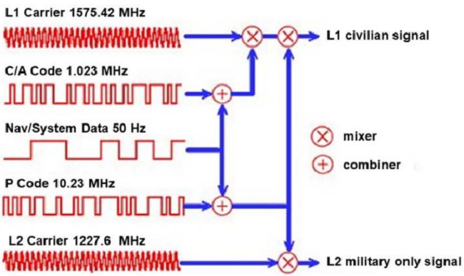 Two different encodings are used (Fig. 1) (Warner & Johnston, 2002), i.e. two PRN codes: Coarse/Acquisition (C/A) code (so-called gold code) on 1.023 MHz and precision (P(Y)) on 10.23 MHz. The signals are modulated to a carrier signal, L1 and L2, by the binary phase shift keying method which encodes 1 bit per phase shift (Betz, 2002). Carrier L1 is modulated with both C/A and P codes, while L2 is modulated only with P code; the C/A code is public and used by civilian GPS receivers, while the P code can be encrypted, and is only available to military equipment with the appropriate description key. Each L1 signal is composed of a navigation message which provides detailed data on the ephemeris (orbit data) of the satellite.