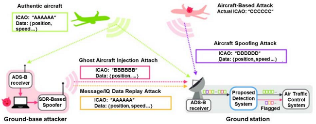 In a message/IQ data replay attack, an attacker from the ground records the content of the messages/IQ data of the received authentic ADS-B messages using an SDR, and then transmits the same messages at a later time without changing the message content. This attack is very sophisticated, because the recorded IQ data contains a lot of information, such as those related to the Doppler effect, the transmitter characteristics, and the channel characteristics, which is difficult to mimic otherwise. In a ghost aircraft injection attack, a ground-based attacker, using an SDR device, transmits fake ADS-B messages with arbitrary content of its choice. In particular, an attacker can simulate the trajectories of non-existent aircraft ("ghosts") and generate appropriate ADS-B messages by carefully selecting Doppler displacements, thus making these "aircrafts-ghosts" visible to earth stations. In an aircraft spoofing attack, an aircraft-based attacker (malicious aircraft) attempts to masquerade as a known or trusted aircraft by spoofing the ICAO address and hide its true identity. Since the aircraft is physically present, the masquerading attack will not be detected even if the secondary radar surveillance system is deployed.